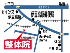 右手の伊東ガス営業所さんの隣奥が当施術院です。「整体」の看板が目印です。↓